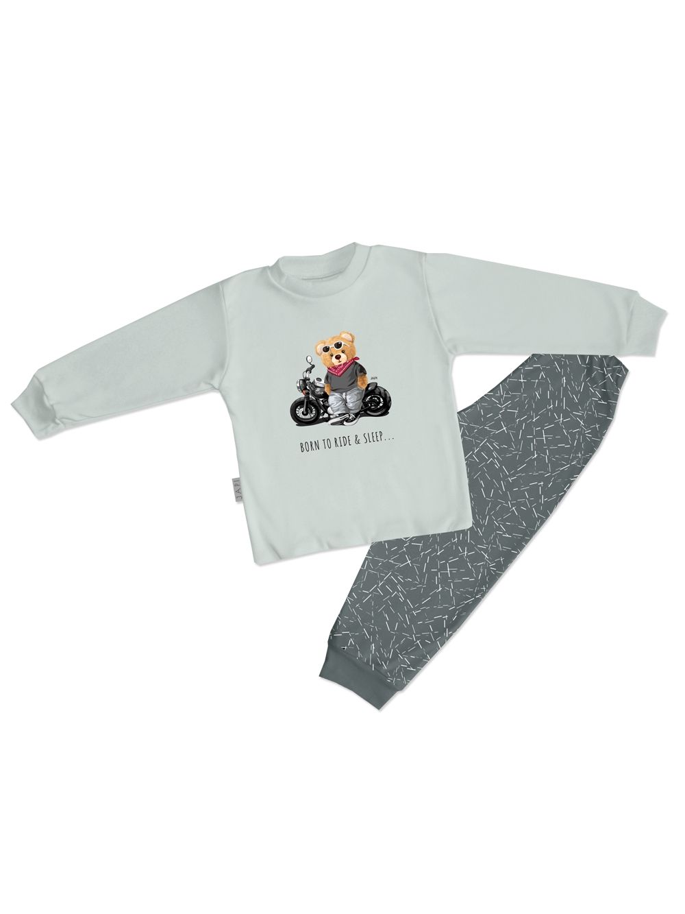 Originalna dječja pidžama za dječake s medvjedićem na motoru RIDER. Gornji dio ukrašen je printom medvjedića na motoru i natpisom koji outfitu daje razigran i buntovan karakter. Izrađena od mekane pamuka, nježna je na dodir i pogodna za dječju kožu. Tamnosive hlače s decentnim uzorkom i elastičnim pojasom pružaju udobnost tijekom cijele noći. Pidžama za dječake ima duge rukave i hlače koje štite od hladnoće. Udoban kroj ne ograničava kretanje i omogućava miran san.