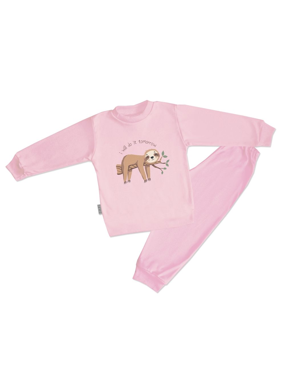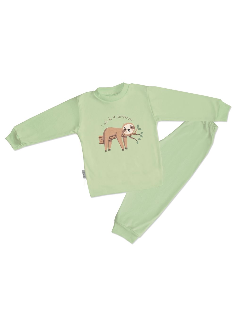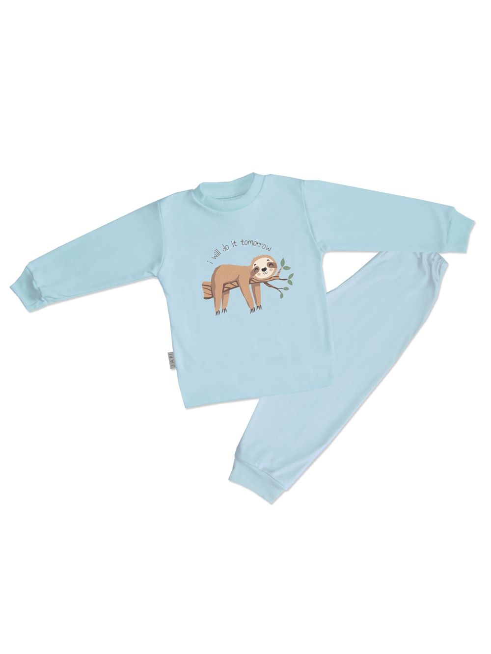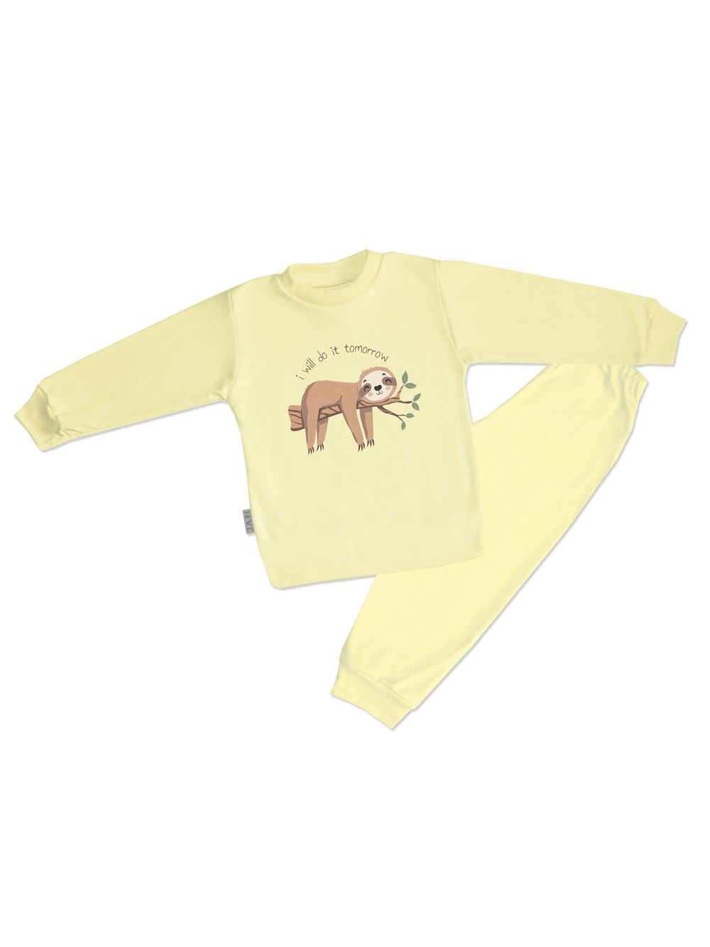 Vesela dječja pidžama s motivom lijenčara TOMORROW idealna je za djecu koja vole udobnost i humor. Gornji dio ukrašava simpatična ilustracija lijenčara s natpisom „I will do it tomorrow“. Pidžama je izrađena od visokokvalitetnog pamuka, mekanog na dodir, prozračnog i nježnog prema osjetljivoj koži. Dostupna je u četiri boje – ružičastoj, žutoj, plavoj i zelenoj, pa svaki mališan može izabrati omiljeni ton. Jednobojne hlače s elastičnim pojasom jamče udobno nošenje tijekom cijele noći. Dječja pidžama ima dugačke rukave i hlače, što je čini pogodnom i za hladnije dane. Praktičan i zabavan izbor za večernju rutinu.