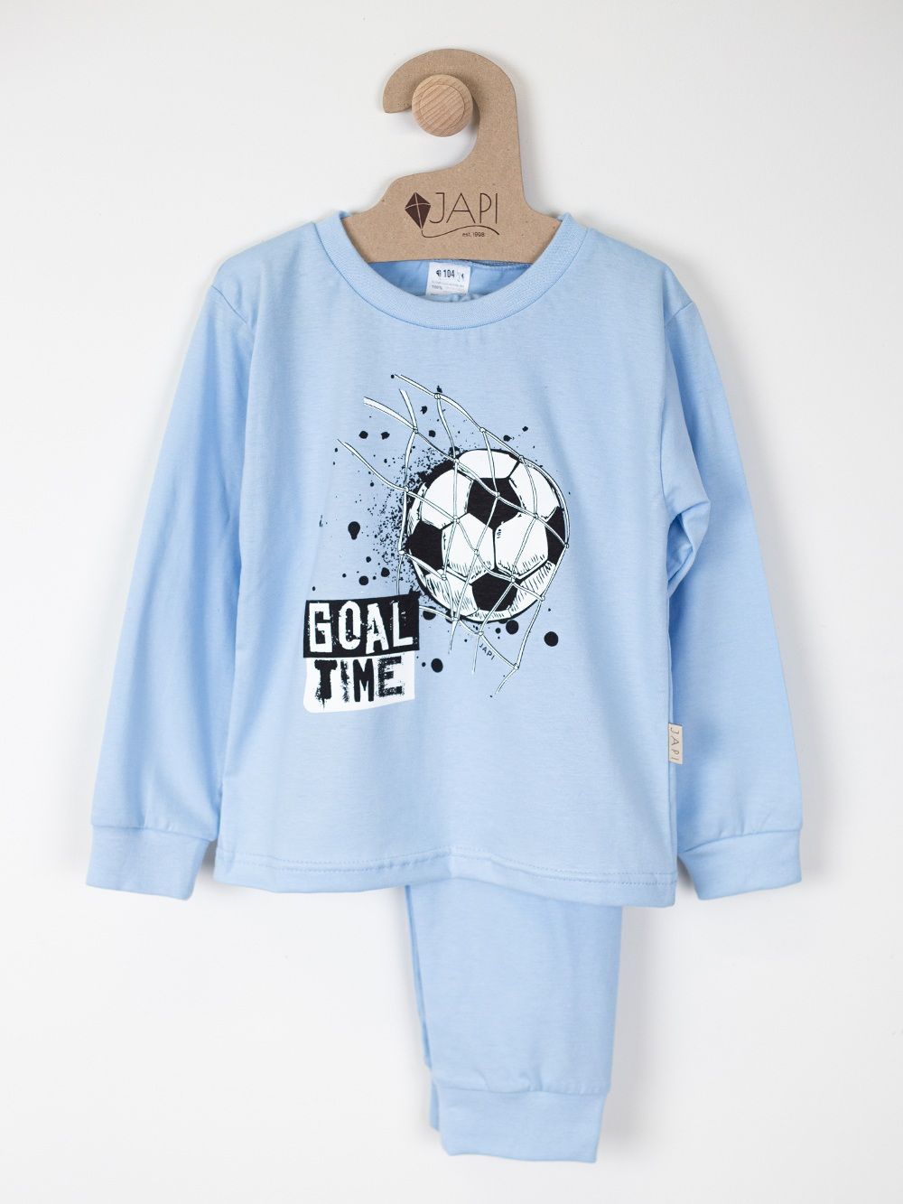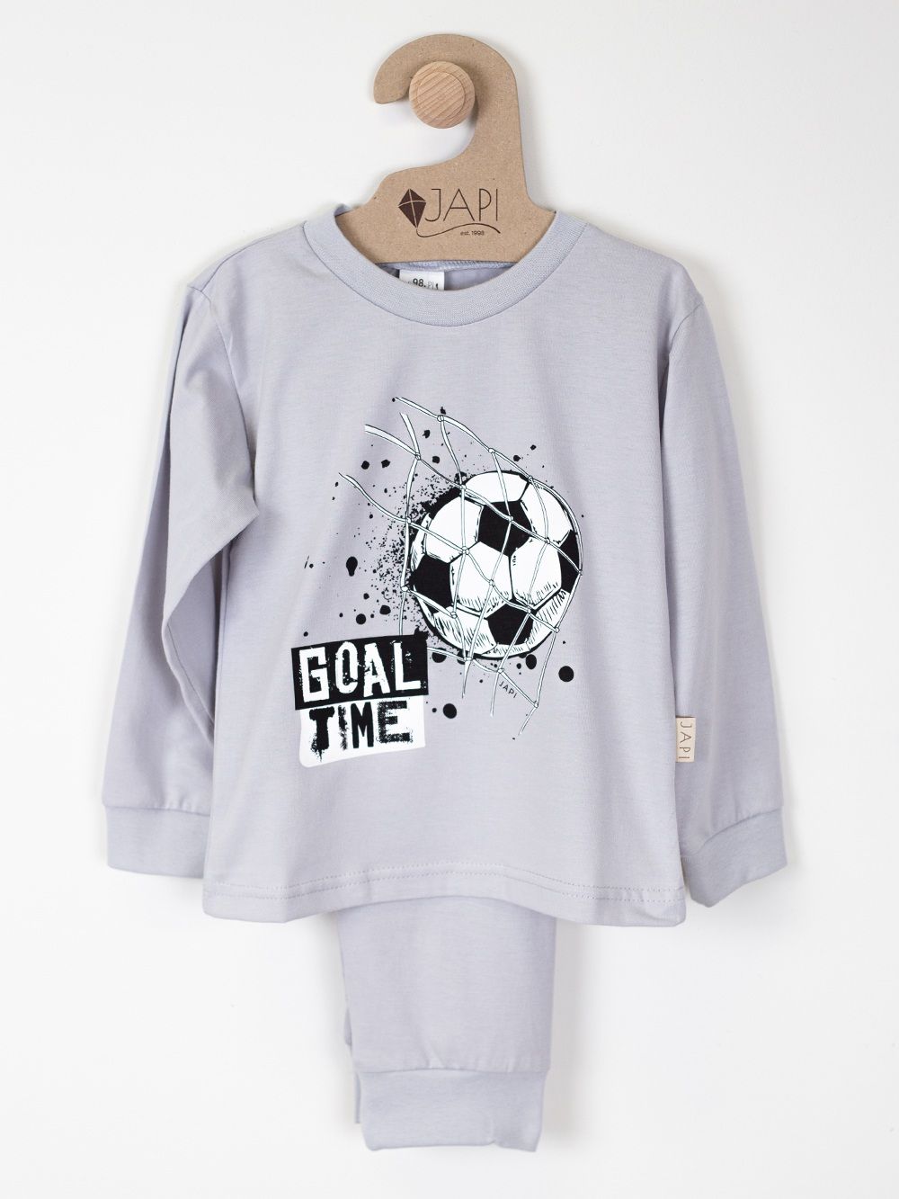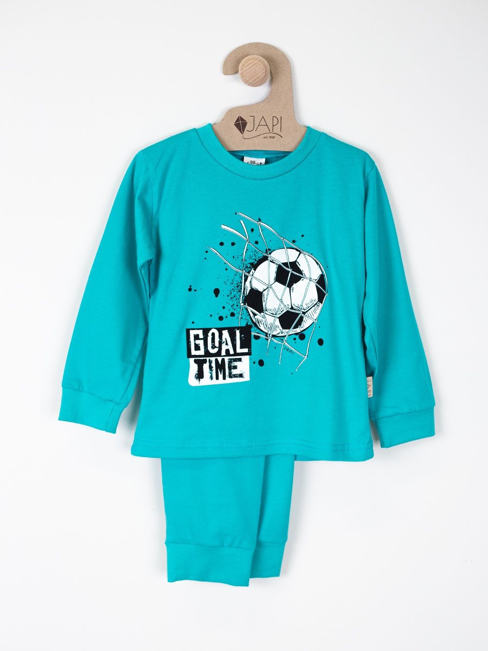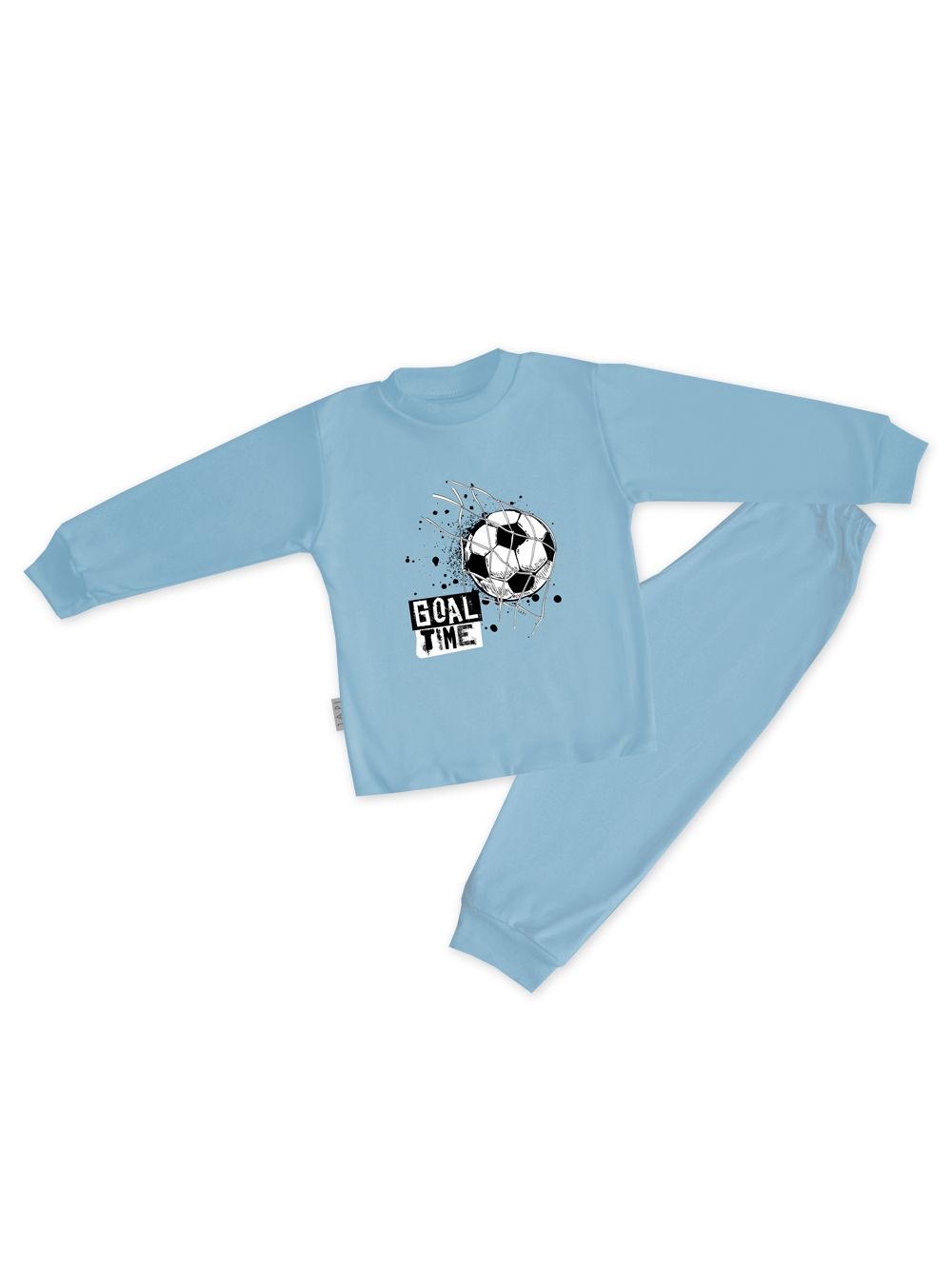 Ova stilska dječja pidžama namijenjena je svim malim nogometašima koji sanjaju o velikim golovima. Izrađena od kvalitetnog materijala, osigurava udobnost tijekom cijele noći. Gornji dio pidžame ukrašen je dinamičnom slikom nogometne lopte i natpisom "Goal Time". Dostupna u četiri trendi boje: svijetloplava, plava, siva i zelena, ova pidžama donosi radost i sportski duh u svaku dječju sobu.