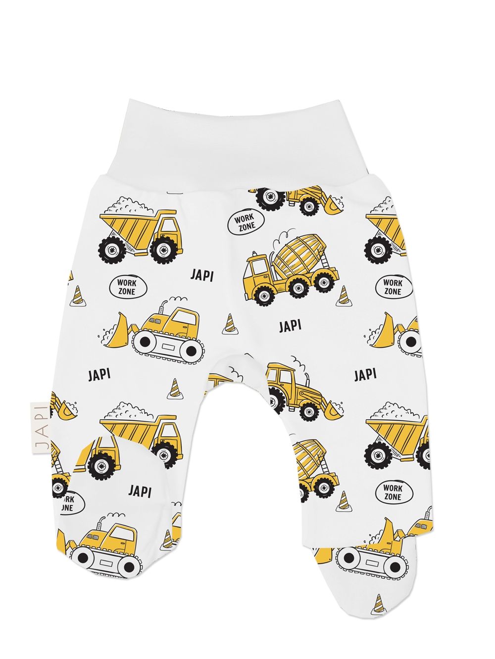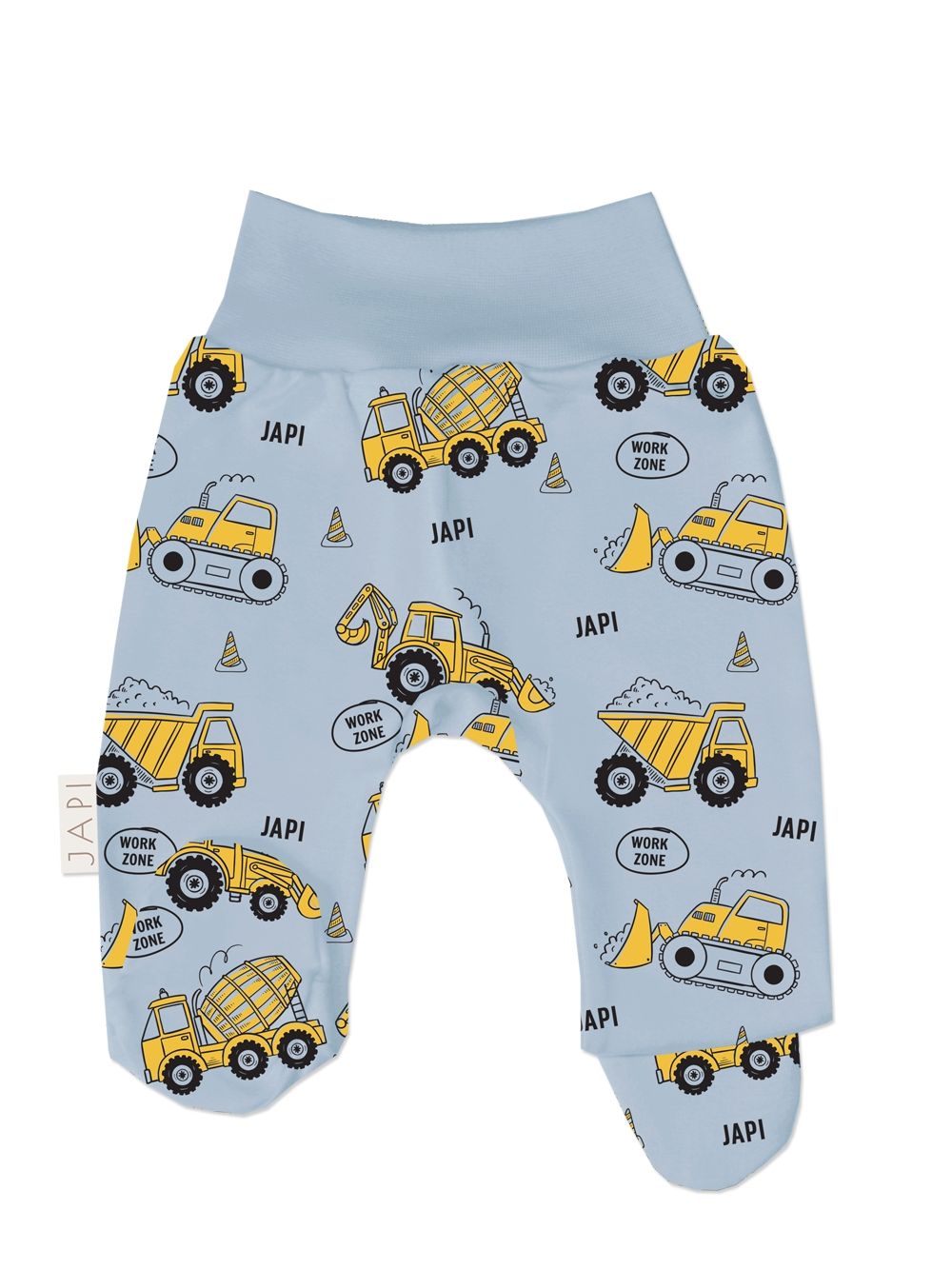 Polukombinezoni su udobnog kroja sa širim pojasom na elastičnu traku. Ne gura, ali u isto vrijeme bebi polukombinezoni ne padaju. Praktičan su komad za manju djecu, jer štite i bebina stopala te ga tako griju. Neće skliznuti kao papuče ili čarape. Možete pronaći polukombinezoni u plavoj, sivoj i bijeloj boji s našim cijelim printom radnih strojeva.