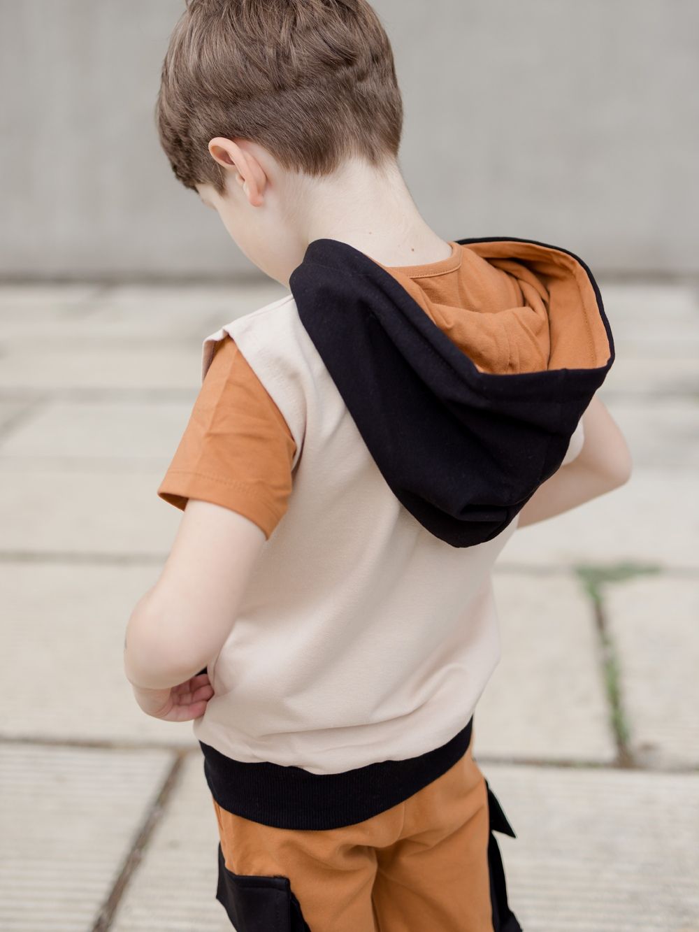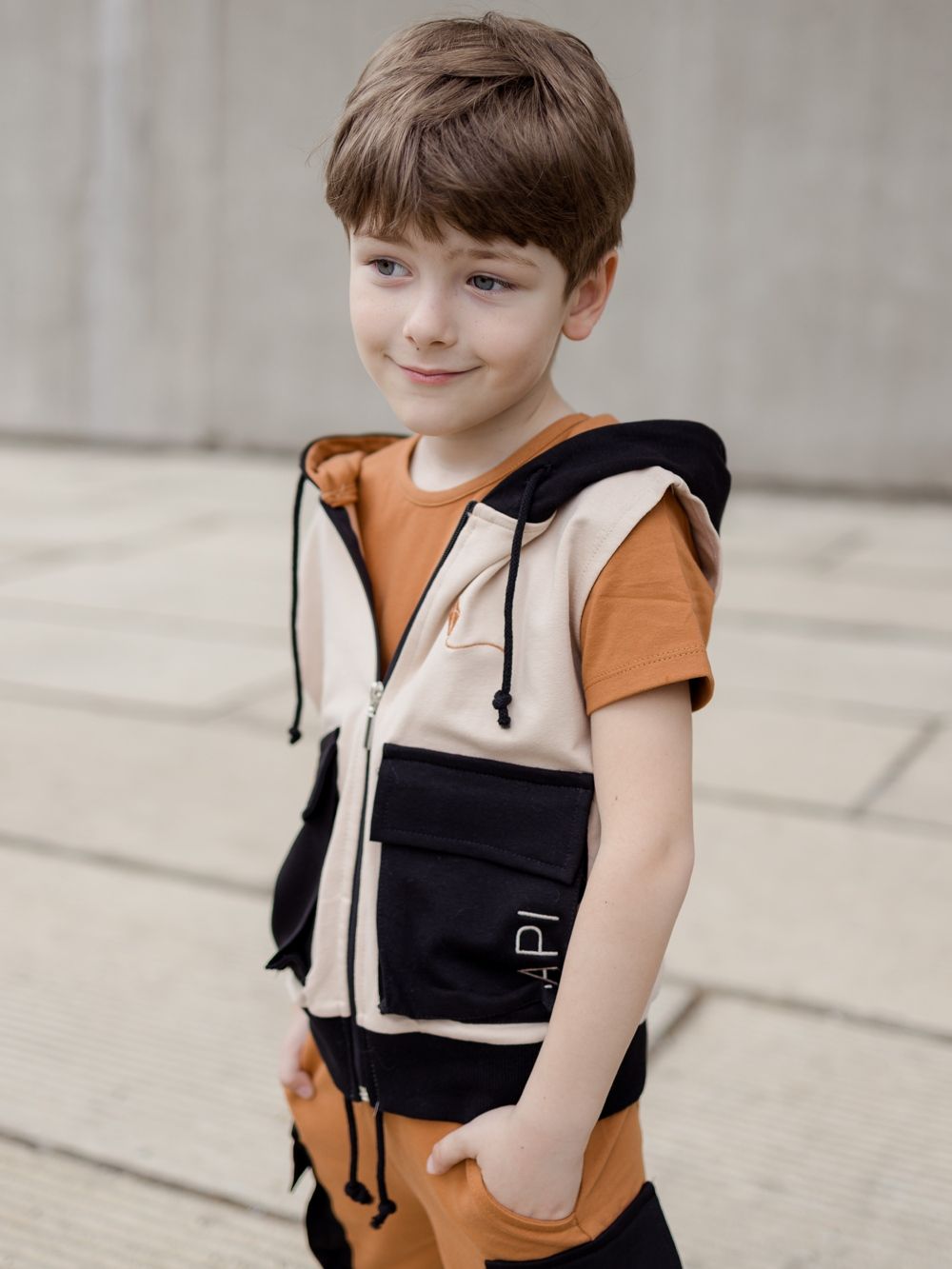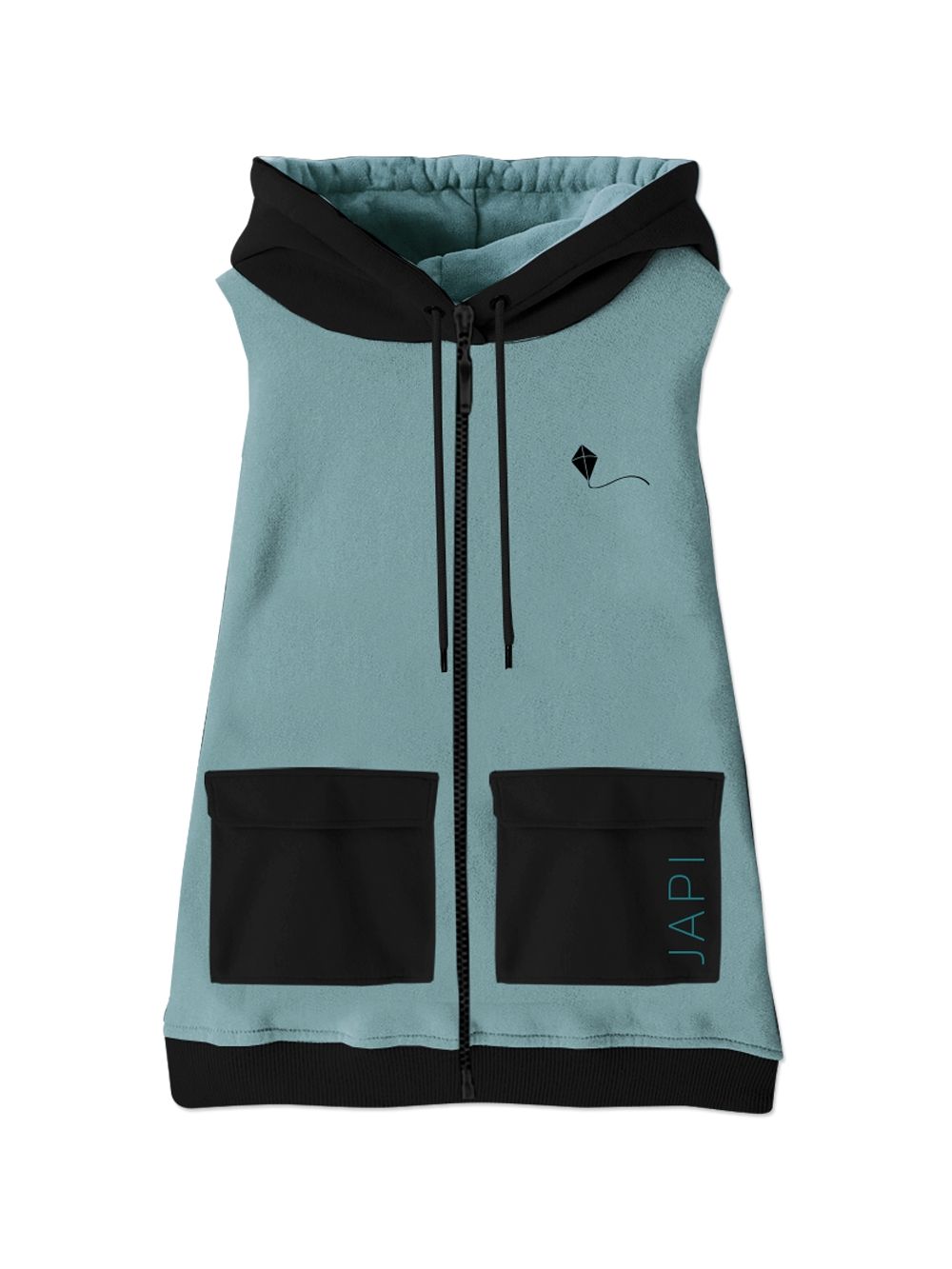 Muški prsluk. Pamuôni prsluk s kapuljačom na patent s velikim bočnim patentima. Kombinacija kontrastnih boja je vrlo moderna i stilska. S ovim prslukom možete dopuniti outfit i zajedno s kratkim hlačama ili trenerkom kreirati usklađeni komplet. Prsluk je pogodan za hladnije ljetne dane iznad majice ili majice s kapuljačom.