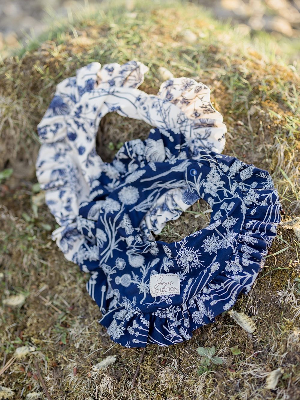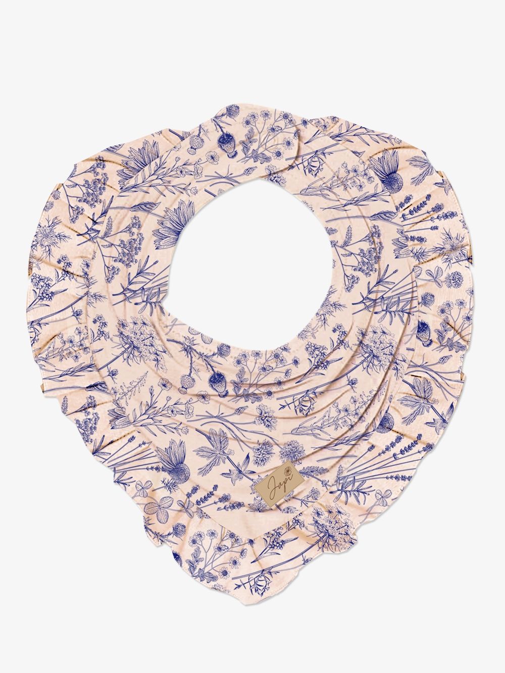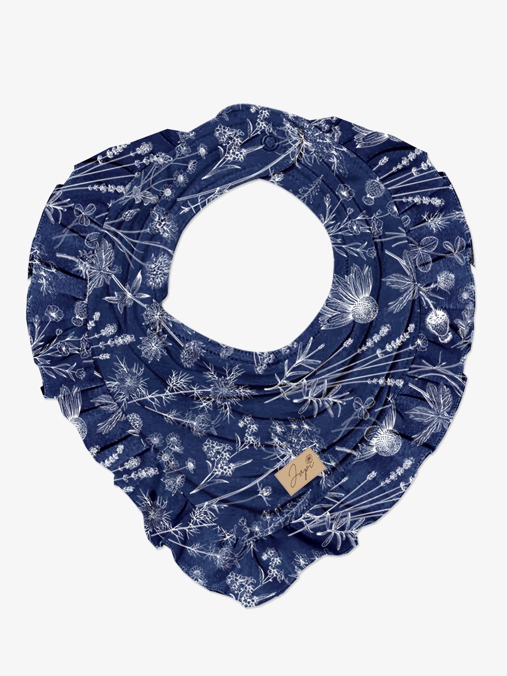 Krasan dječji podbradnik, koji štiti odjeću. Pamučni podbradnik ili marama su krasan dodatak i praktičan pomoćnik. Oblik trokuta s volanskim krajem. U kolekciji Herbarium smo kreirali vlastiti tisak. Biljke na kontrastnoj podlozi. Modre na krem boji ili obrnuto.
