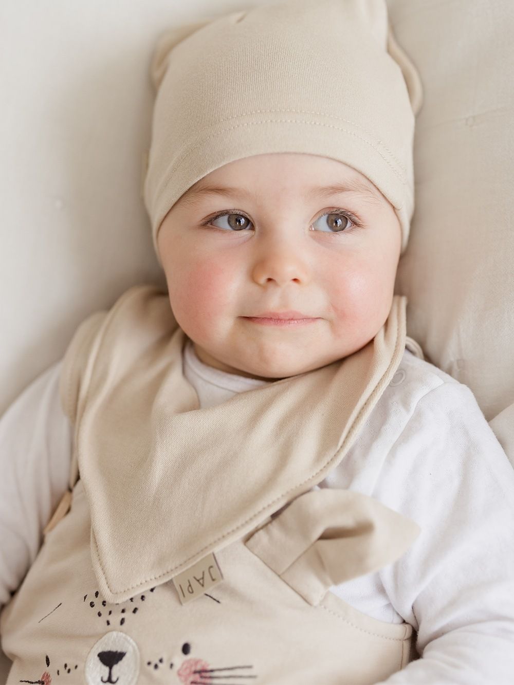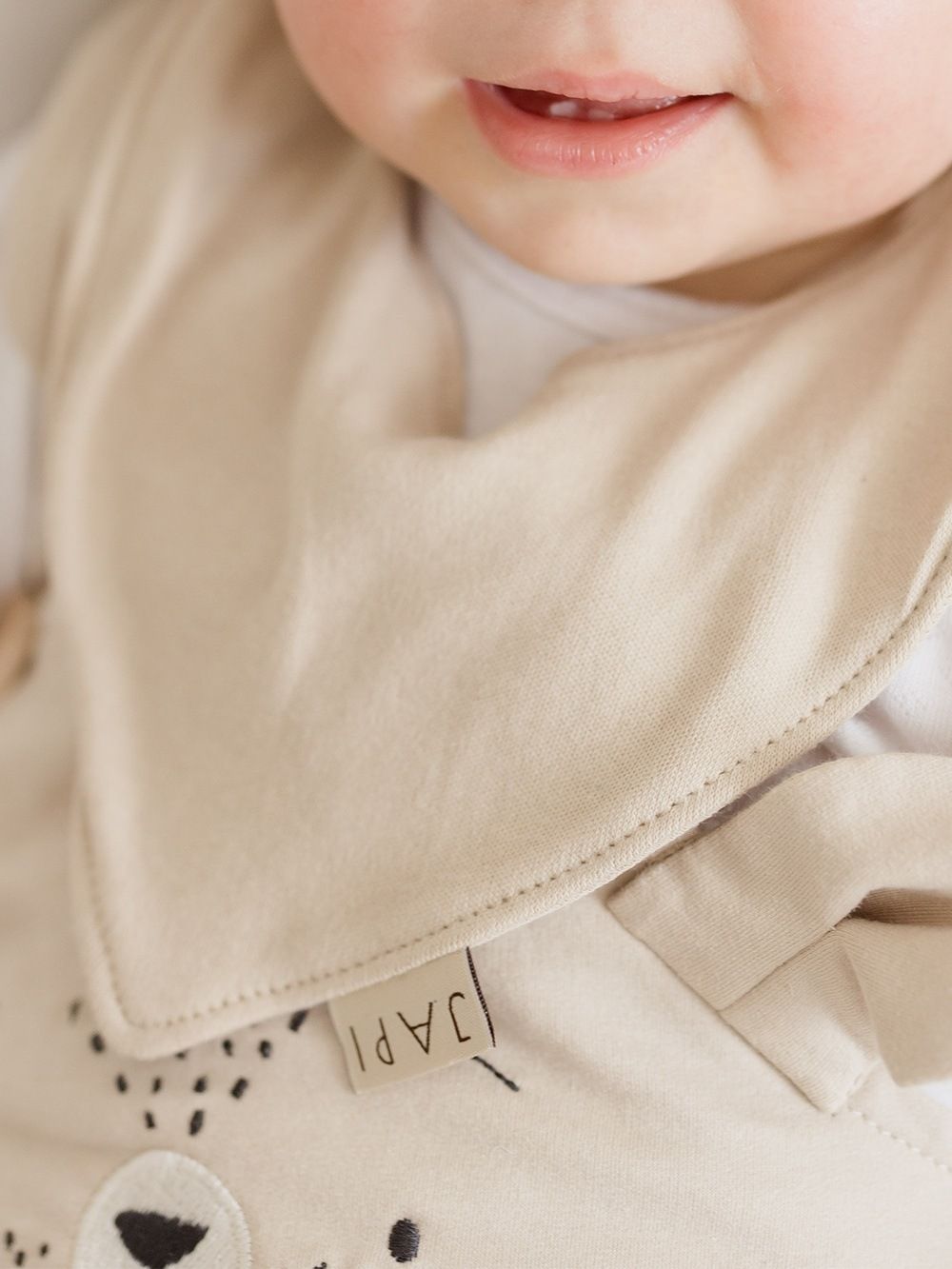 Slinček jednostavno kopčom pričvrstite oko vrata djeteta. Zaštitit će odjeću već tijekom prvih obroka ili na početku samostalnog hranjenja.