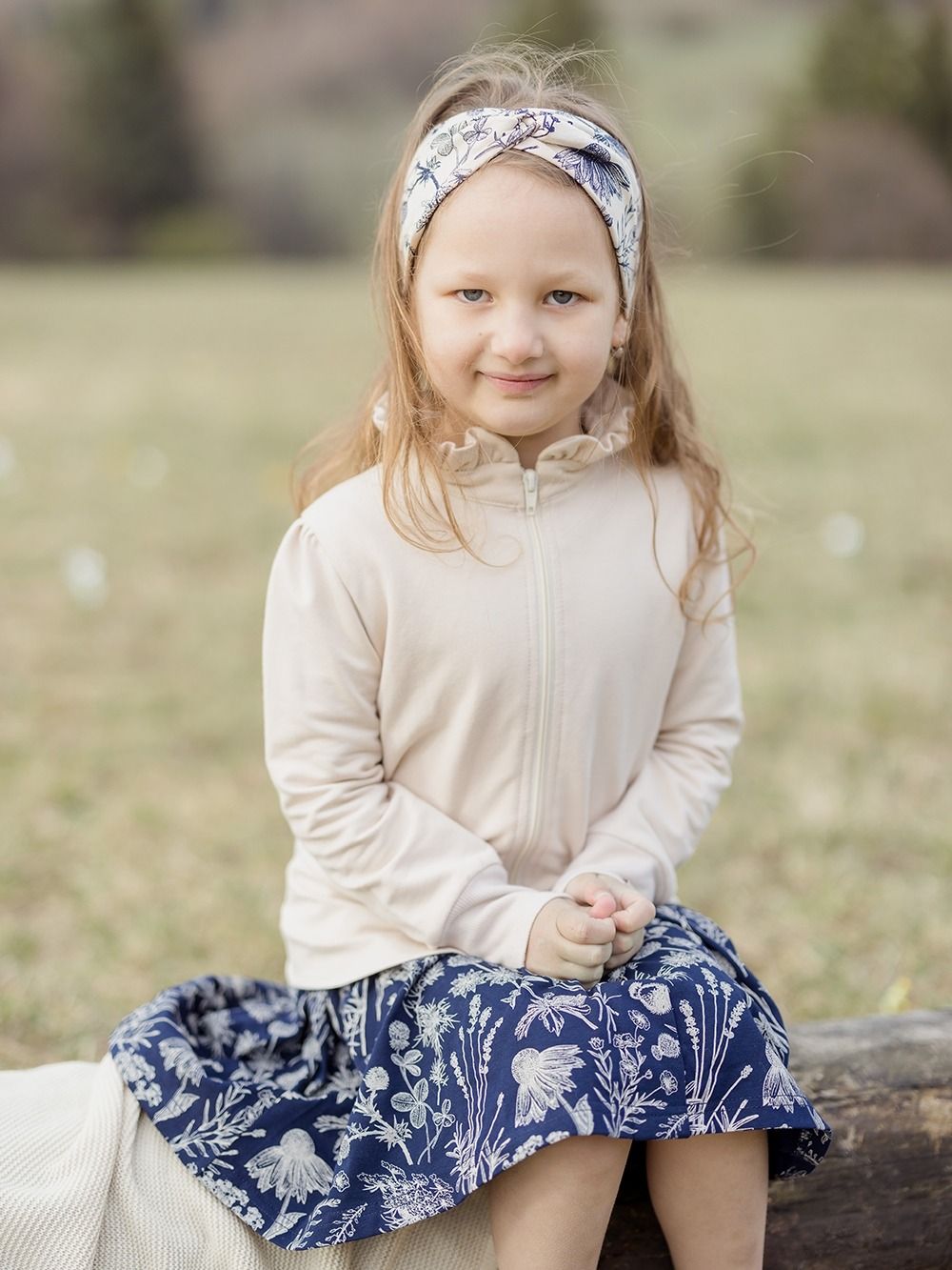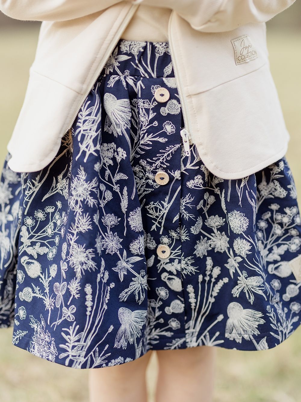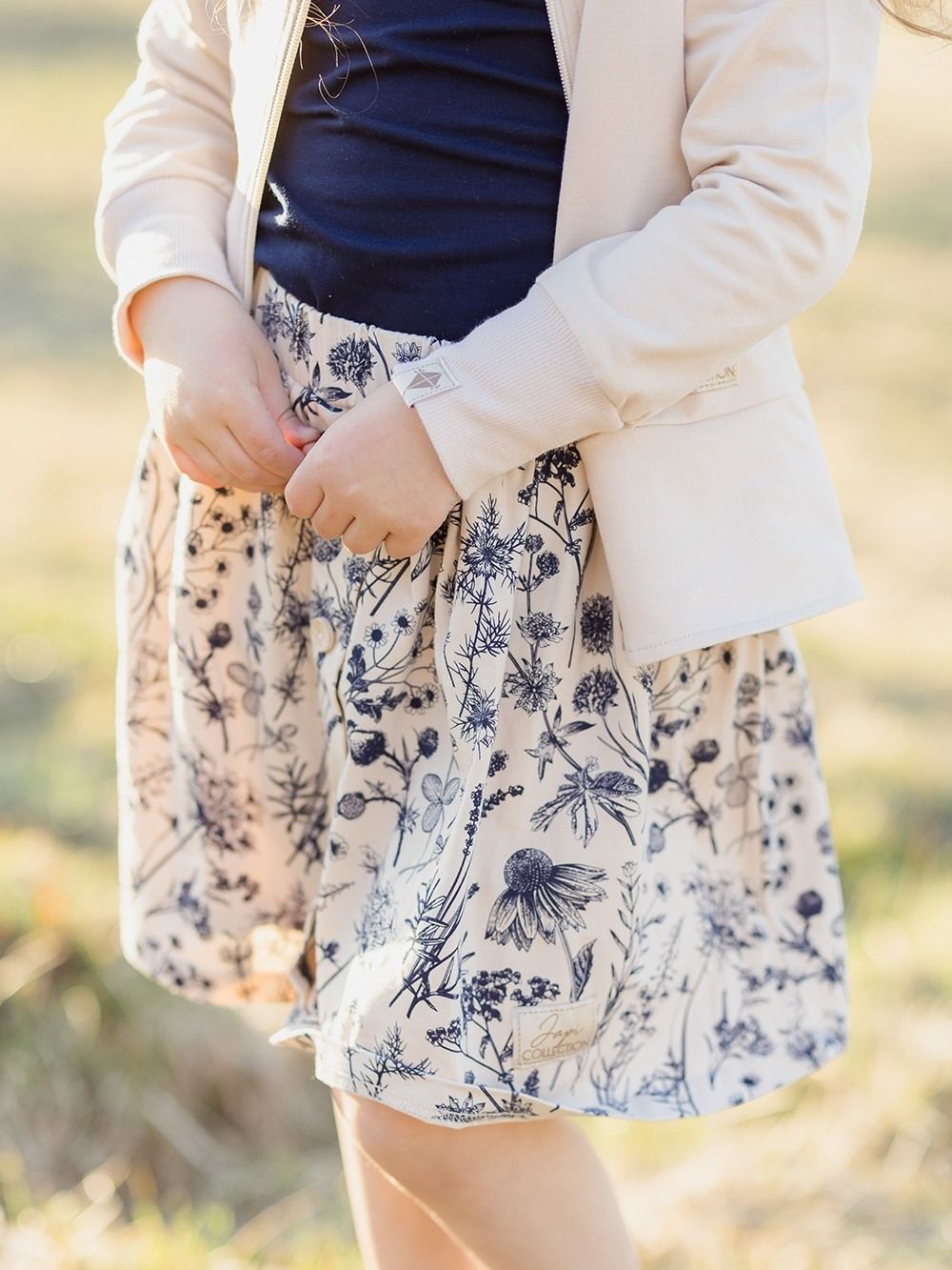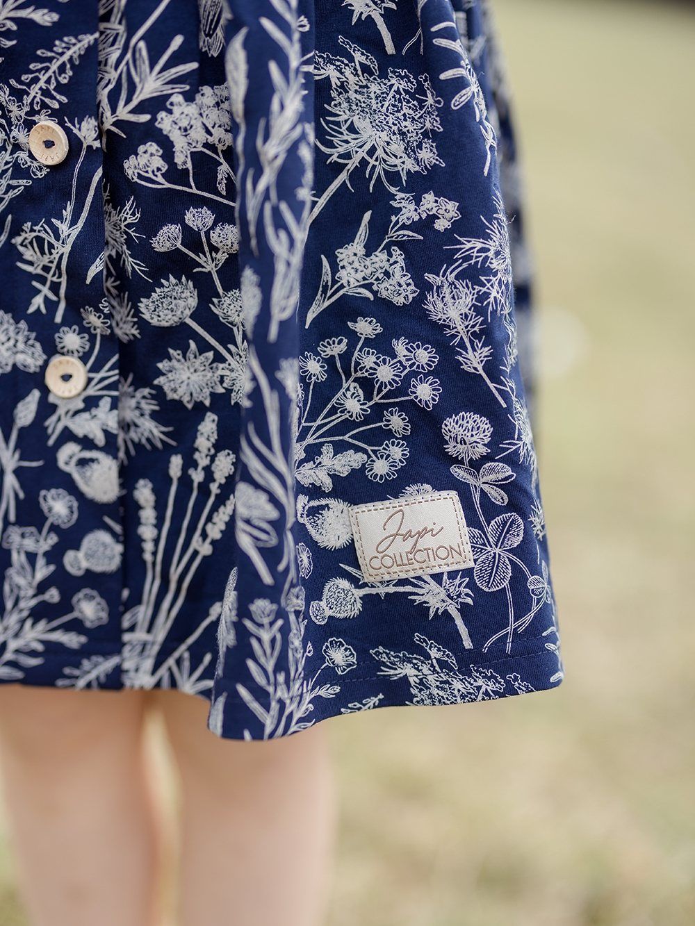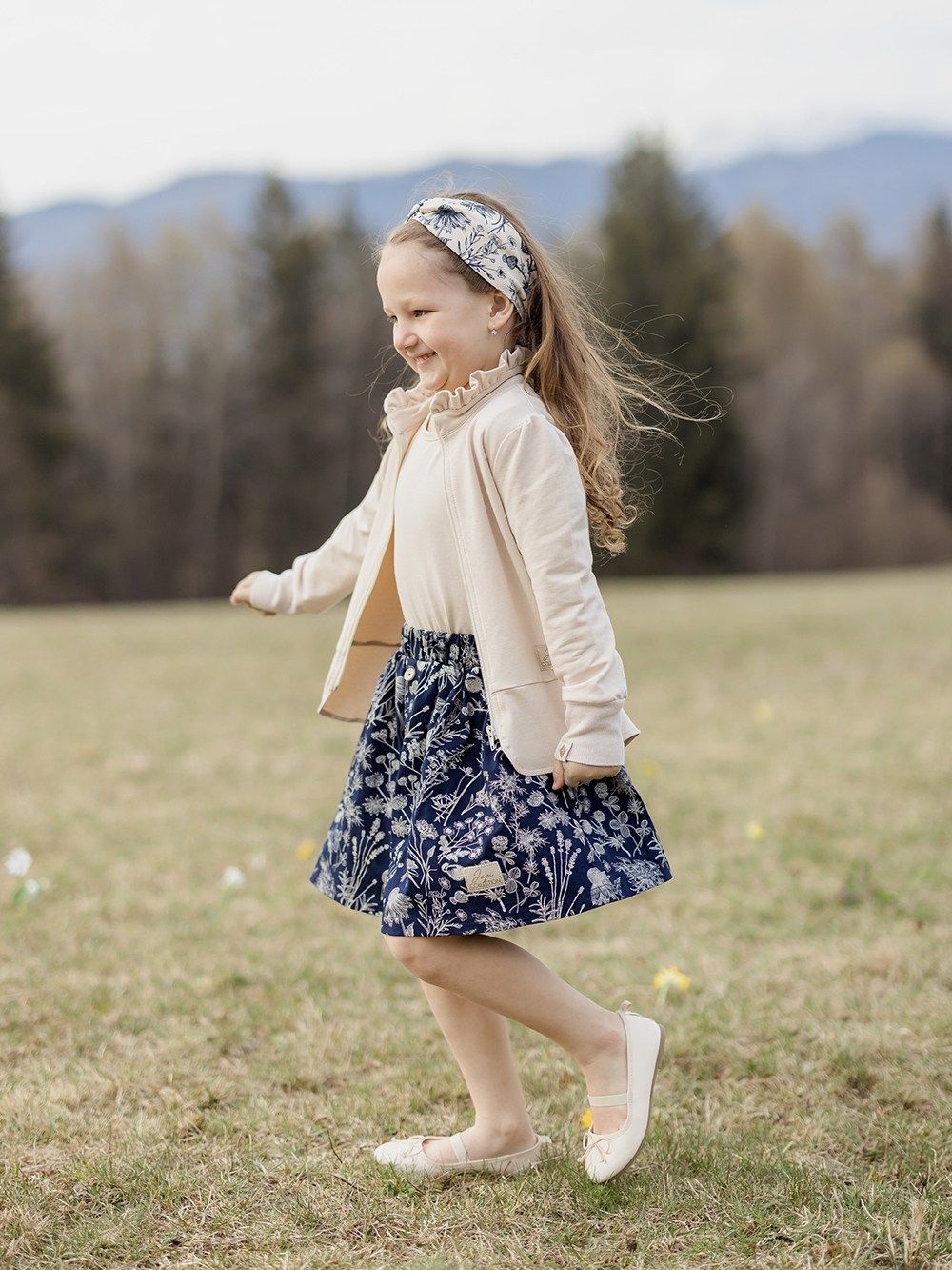 Naš vlastiti tisak smo kreirali od biljaka s naših livada i polja U kontrastu je s bojom temeljne podloge tkanine. Djevojčice si uz suknju mogu odjenuti jednostavnu bijelu majicu i tenisice ili platnene cipele. Ljetni outfit je tu, možete izaći do slastičarnice na sladoled ili u šetnju parkom.