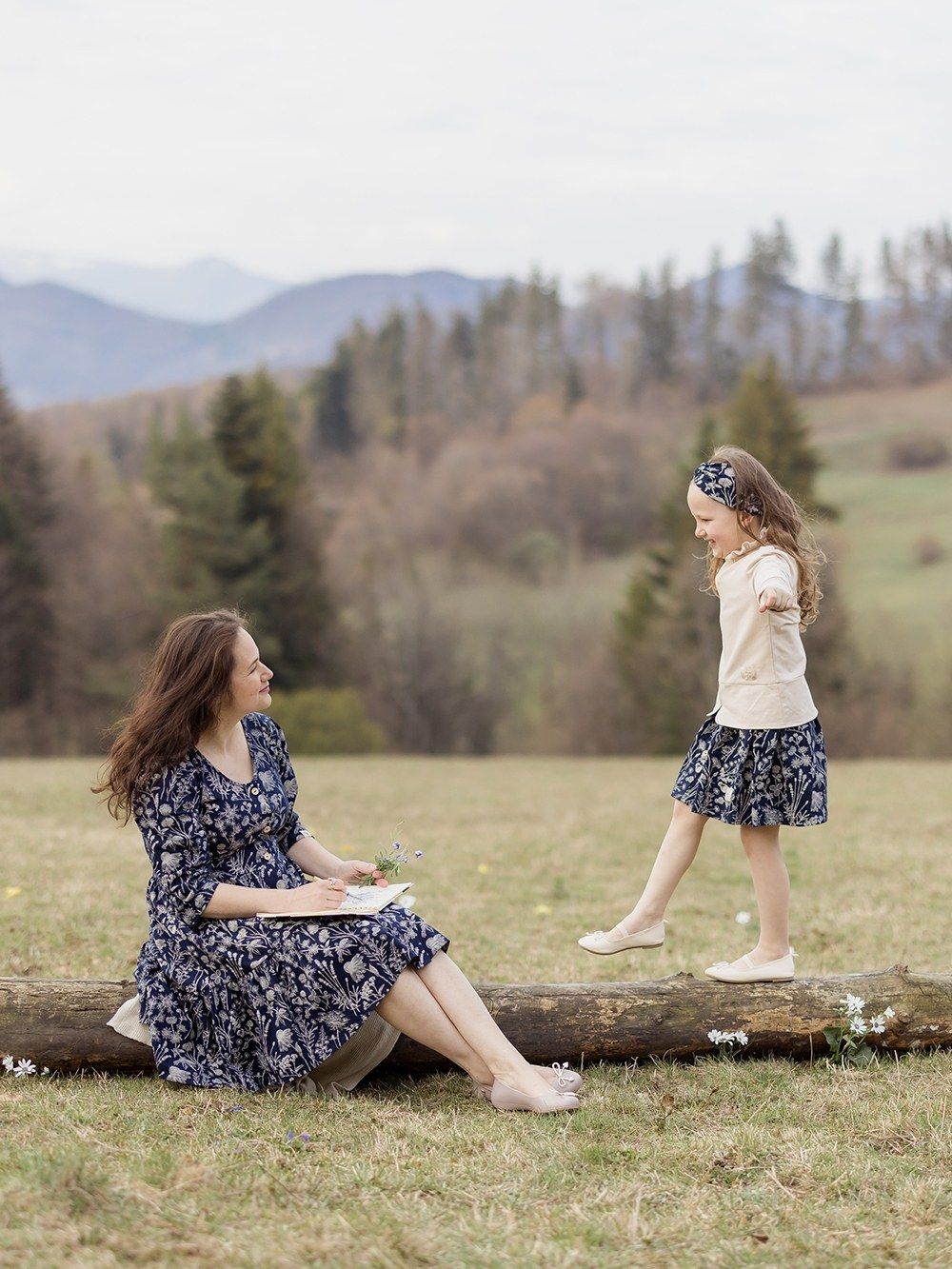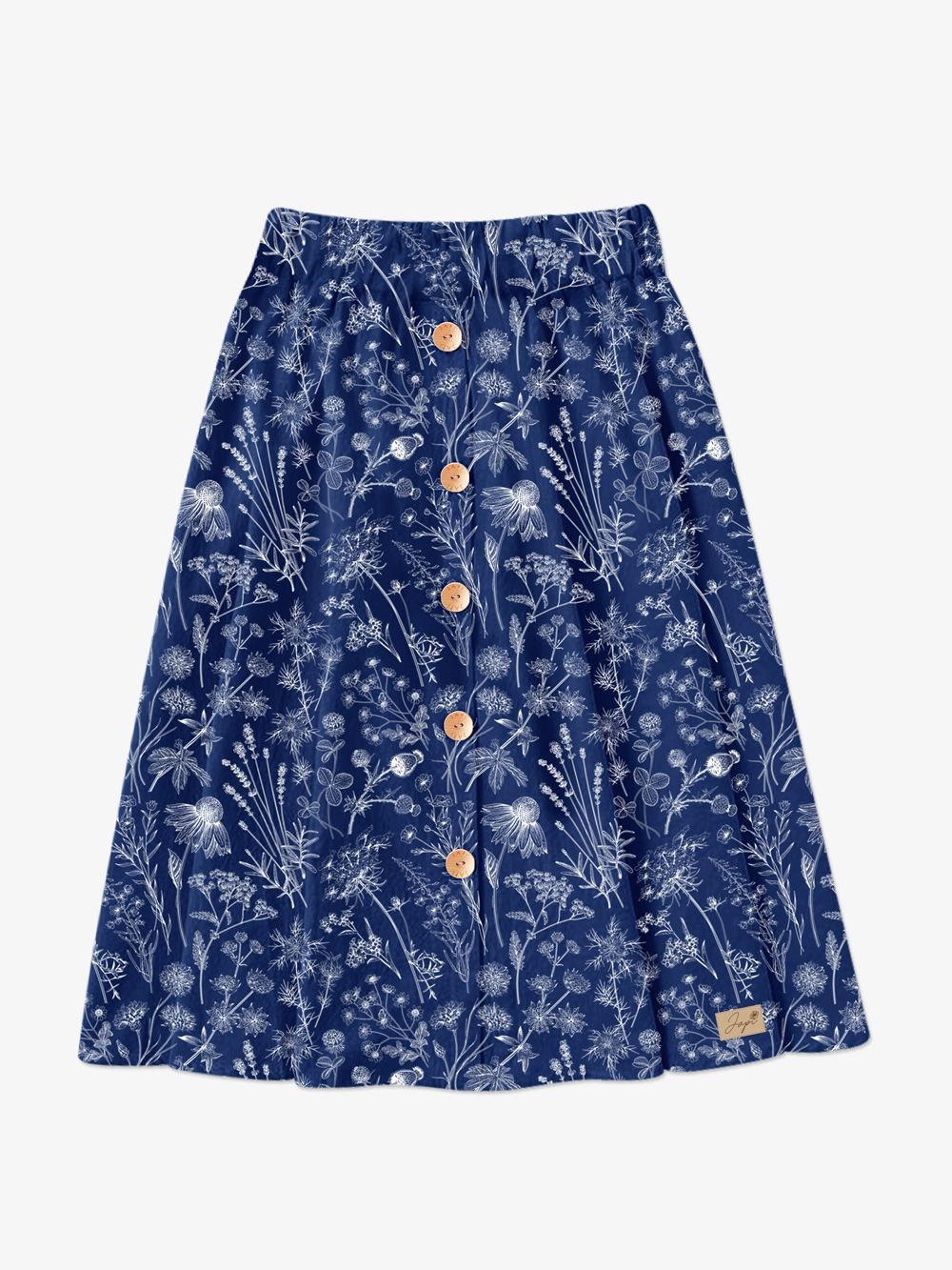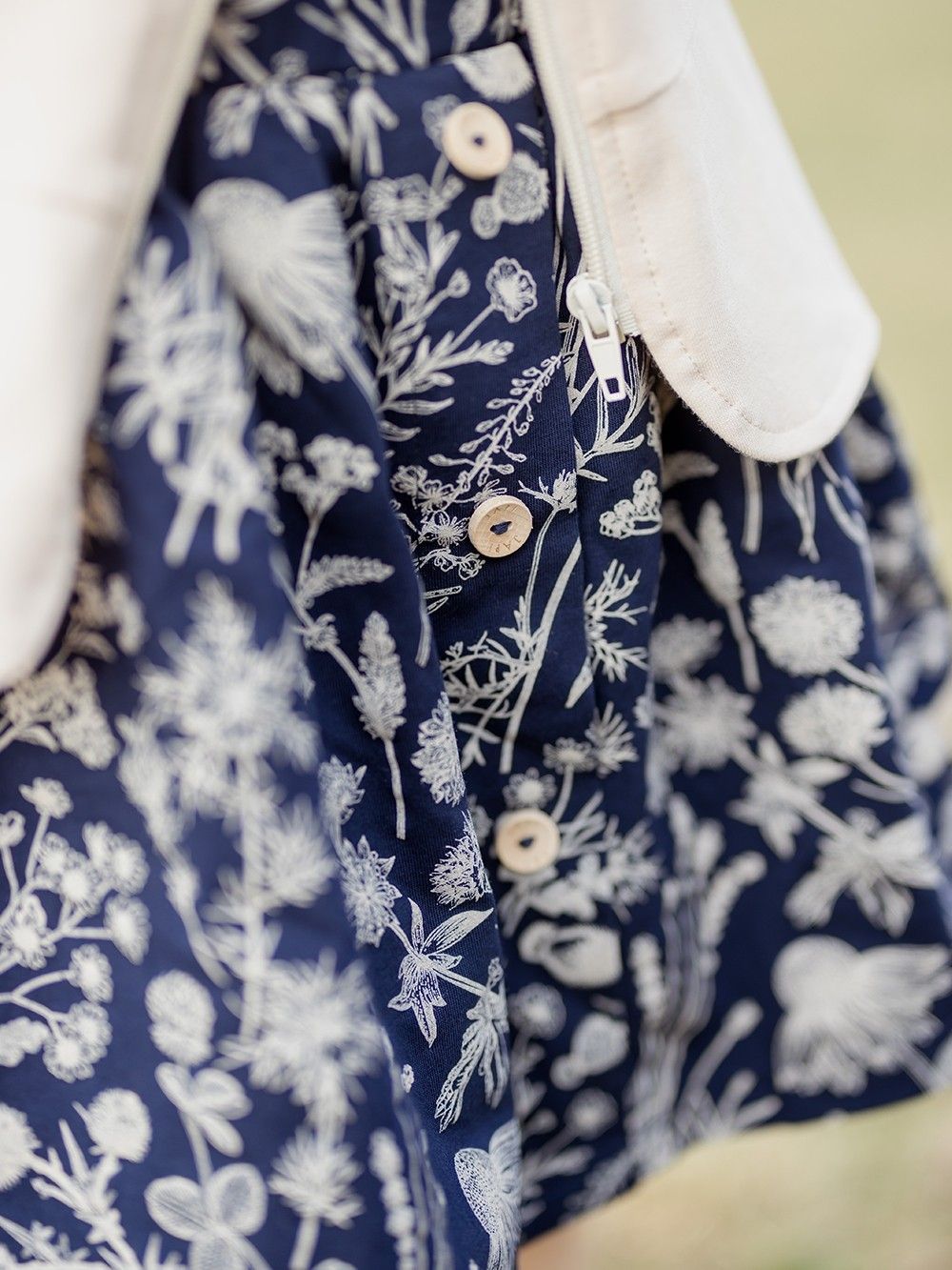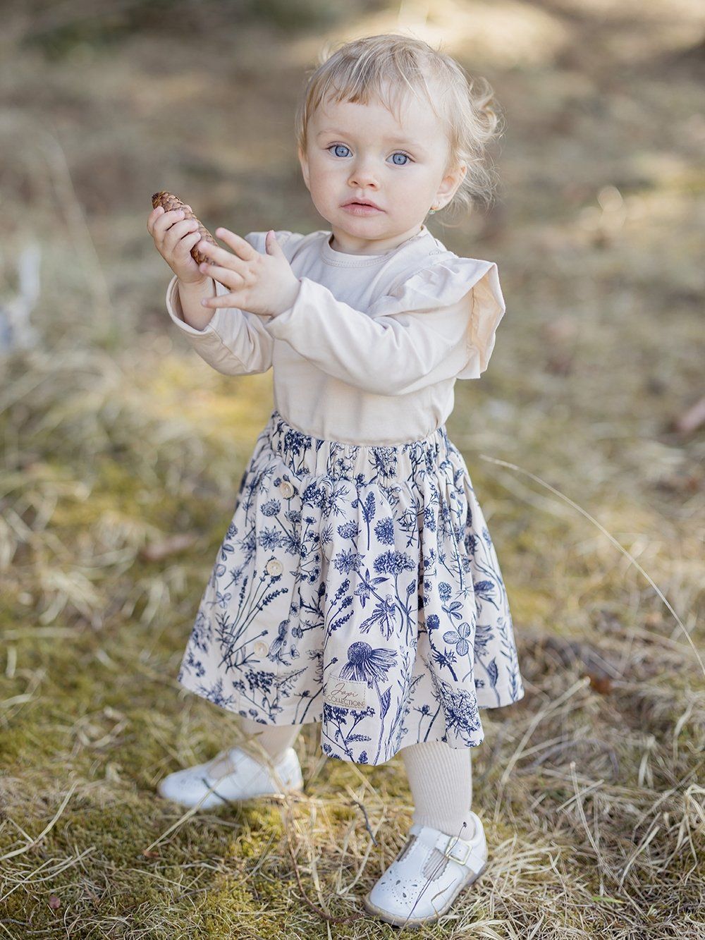 Naš vlastiti tisak smo kreirali od biljaka s naših livada i polja U kontrastu je s bojom temeljne podloge tkanine. Djevojčice si uz suknju mogu odjenuti jednostavnu bijelu majicu i tenisice ili platnene cipele. Ljetni outfit je tu, možete izaći do slastičarnice na sladoled ili u šetnju parkom.