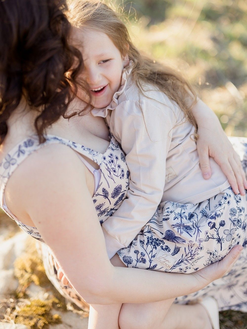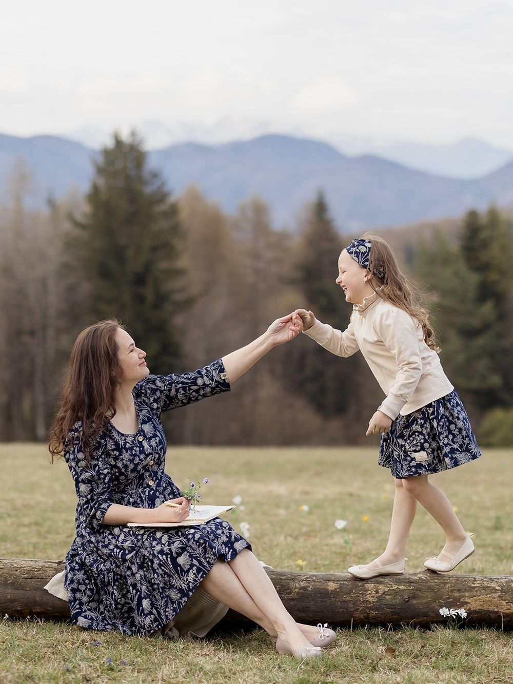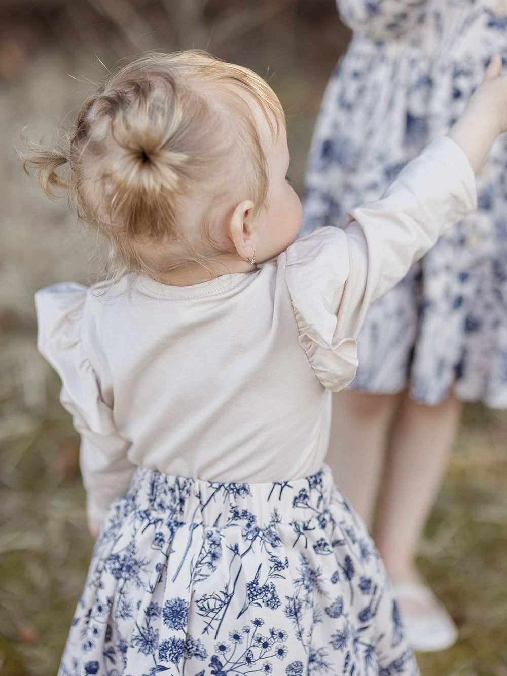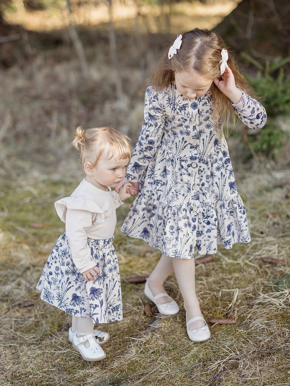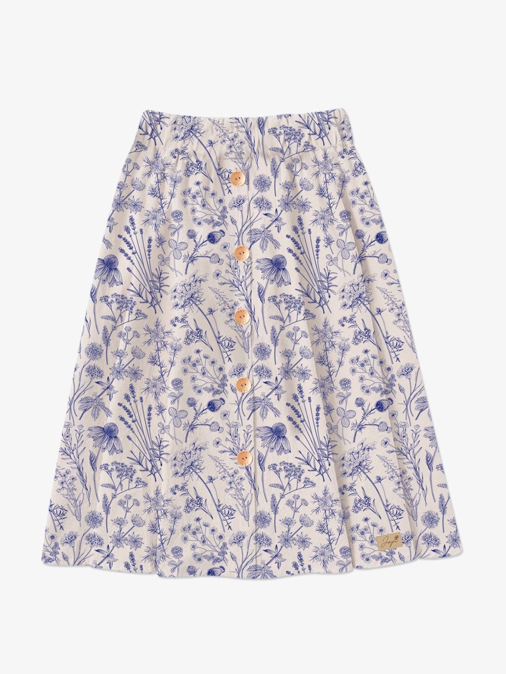 Naš vlastiti tisak smo kreirali od biljaka s naših livada i polja U kontrastu je s bojom temeljne podloge tkanine. Djevojčice si uz suknju mogu odjenuti jednostavnu bijelu majicu i tenisice ili platnene cipele. Ljetni outfit je tu, možete izaći do slastičarnice na sladoled ili u šetnju parkom.