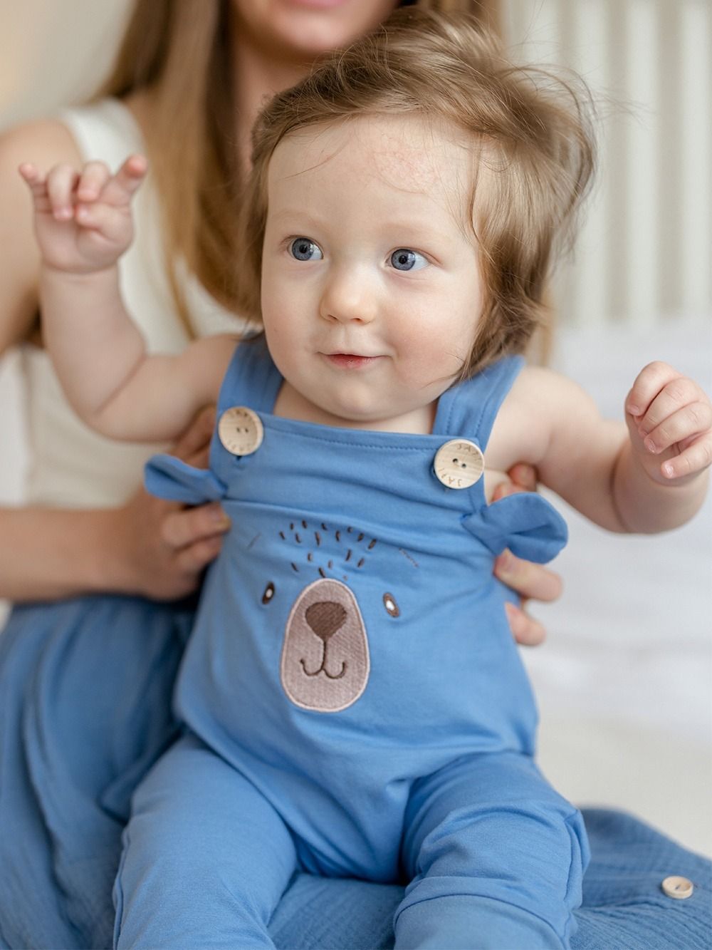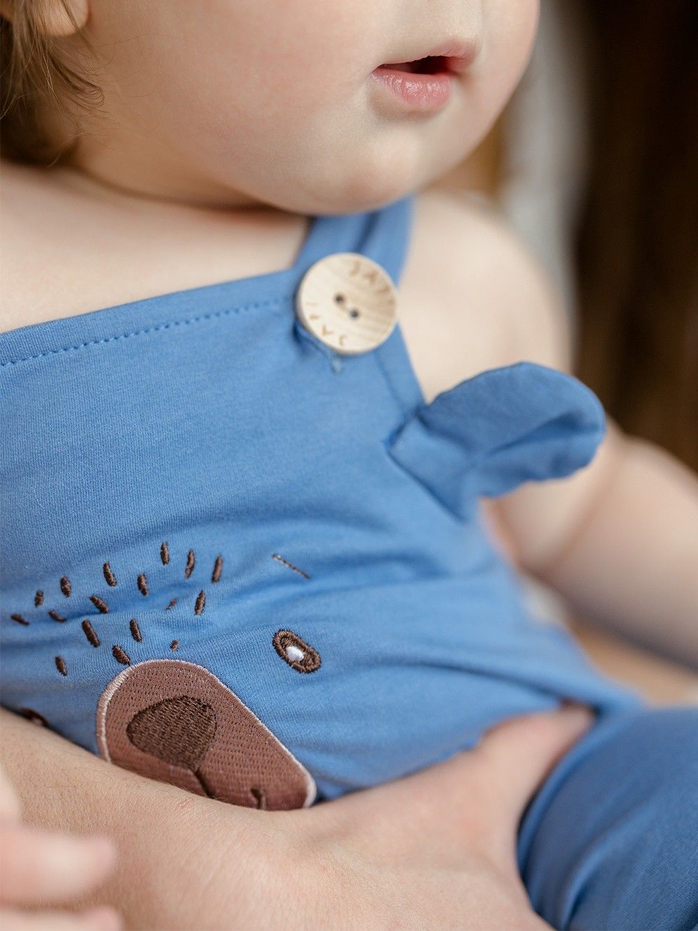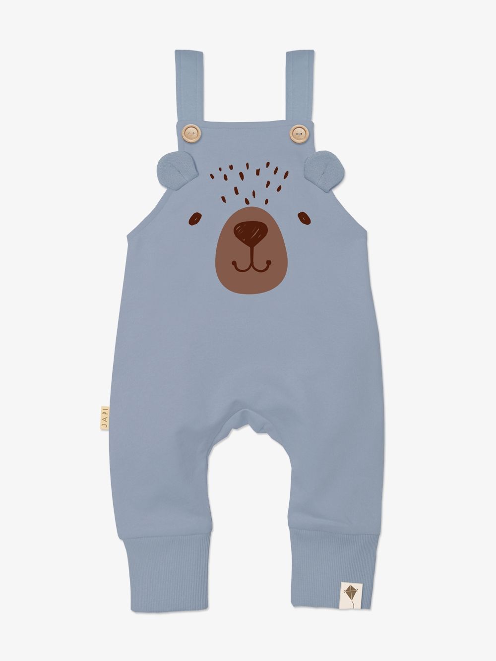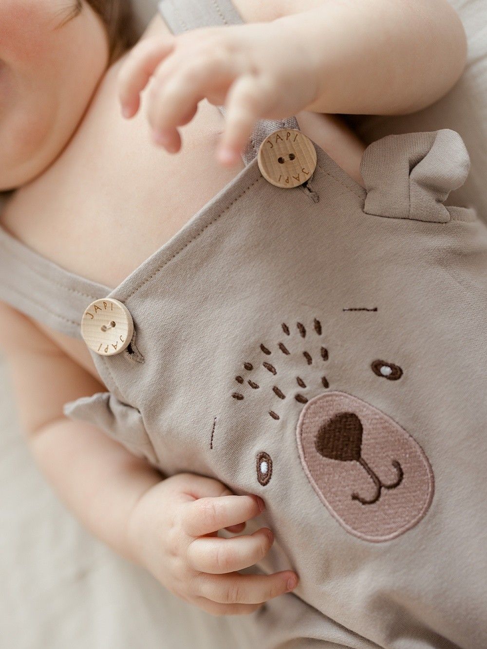 Malim istraživačima zasigurno će se svidjeti ovaj elegantni medo. Zadivit će ih svojim licem i našivenim ušima na prednjem dijelu. Mame će cijeniti kvalitetan materijal i udoban kroj. Šire patente možete smotati na donji dio hlača po potrebi. Hlače se kopčaju drvenim gumbima na ramenima.