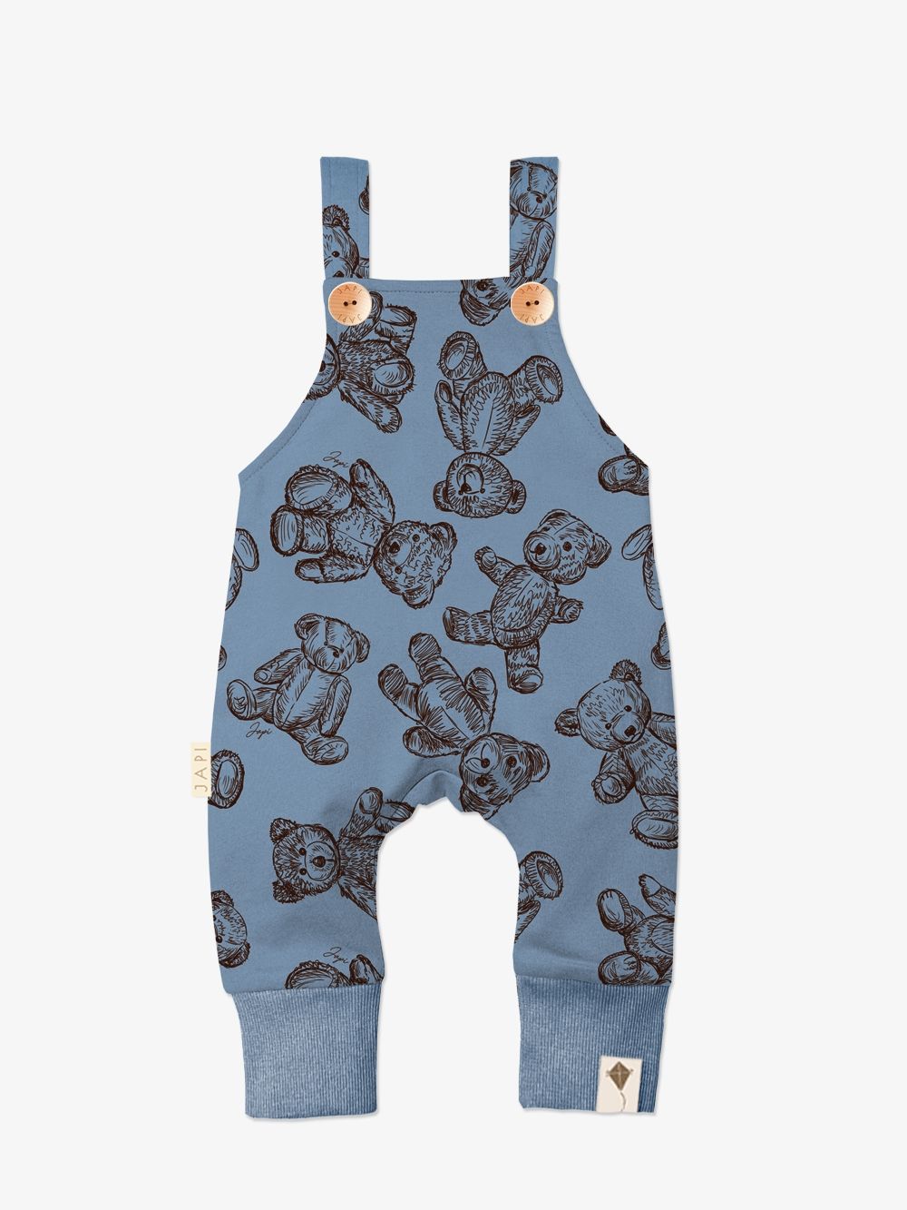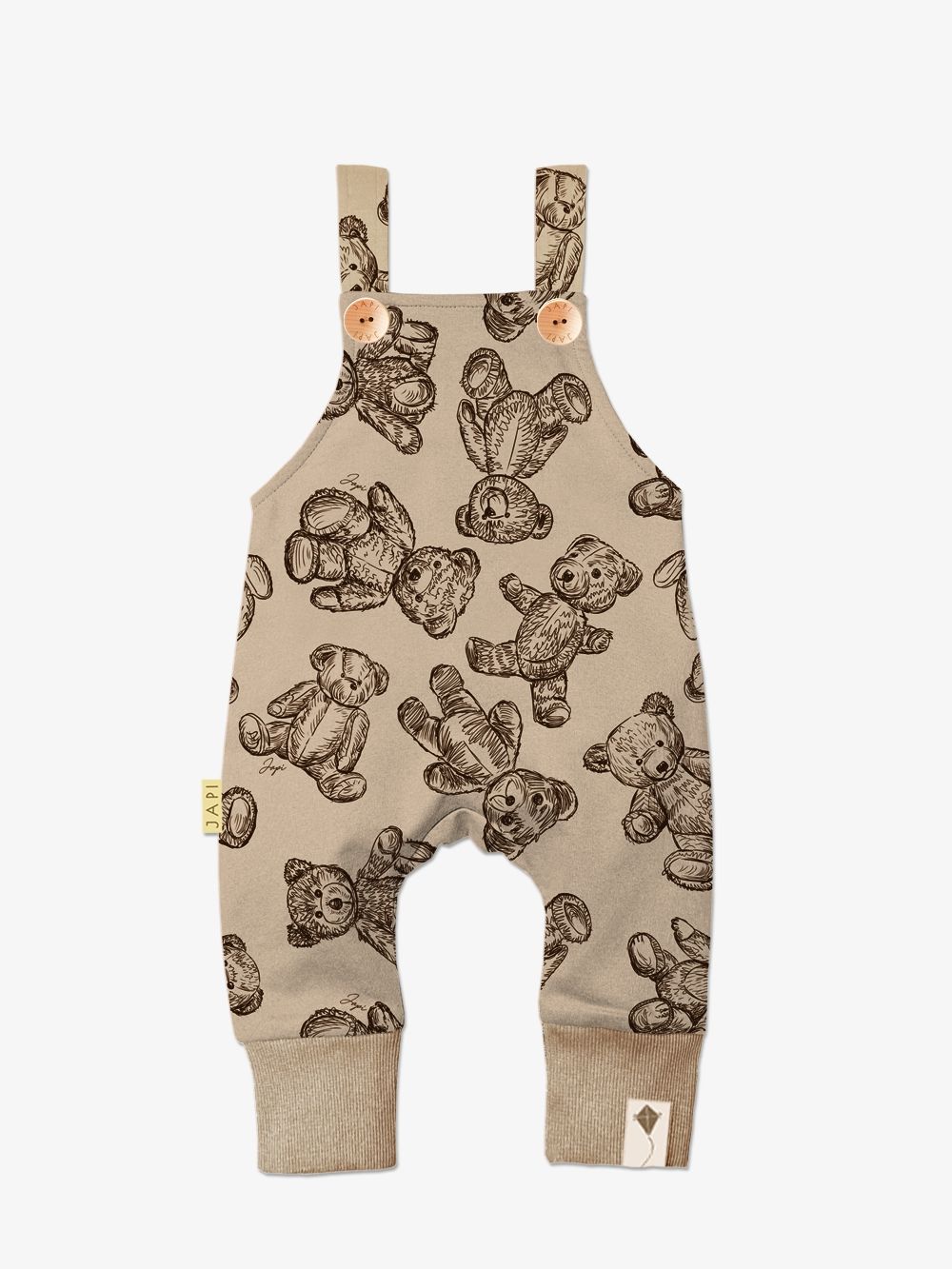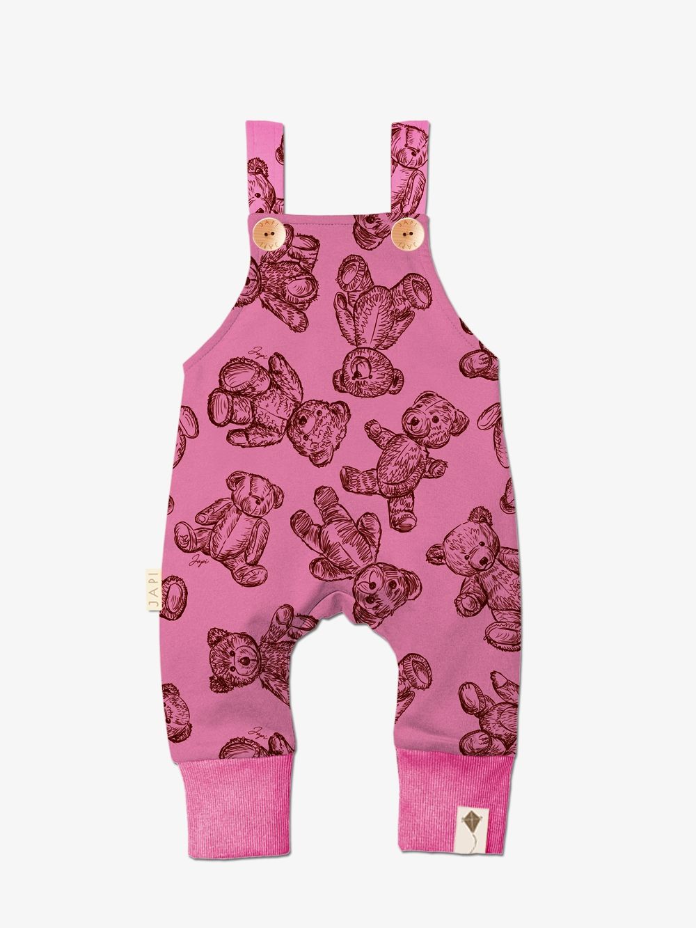 Napravili smo trenirke od 100% pamuka s našim printom plišanog medvjedića na cijeloj površini. Smeđi print lijepo se ističe na bež, plavoj i ružičastoj boji. Trenirka se s prednje strane otvara drvenim gumbima. U donjem dijelu imaju šire pletenice pa ih po potrebi možete prilagoditi.