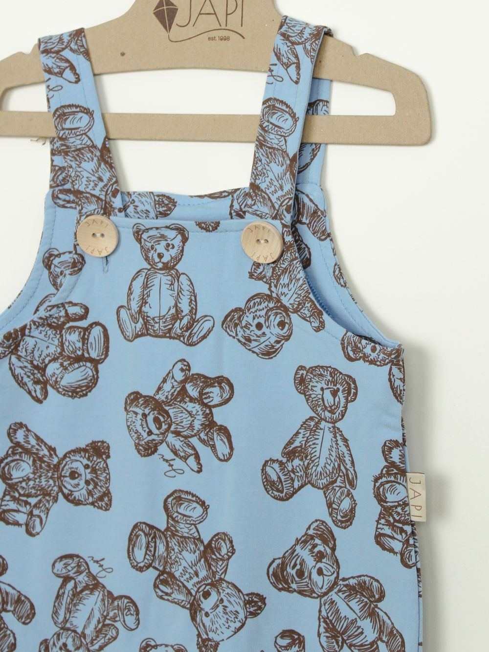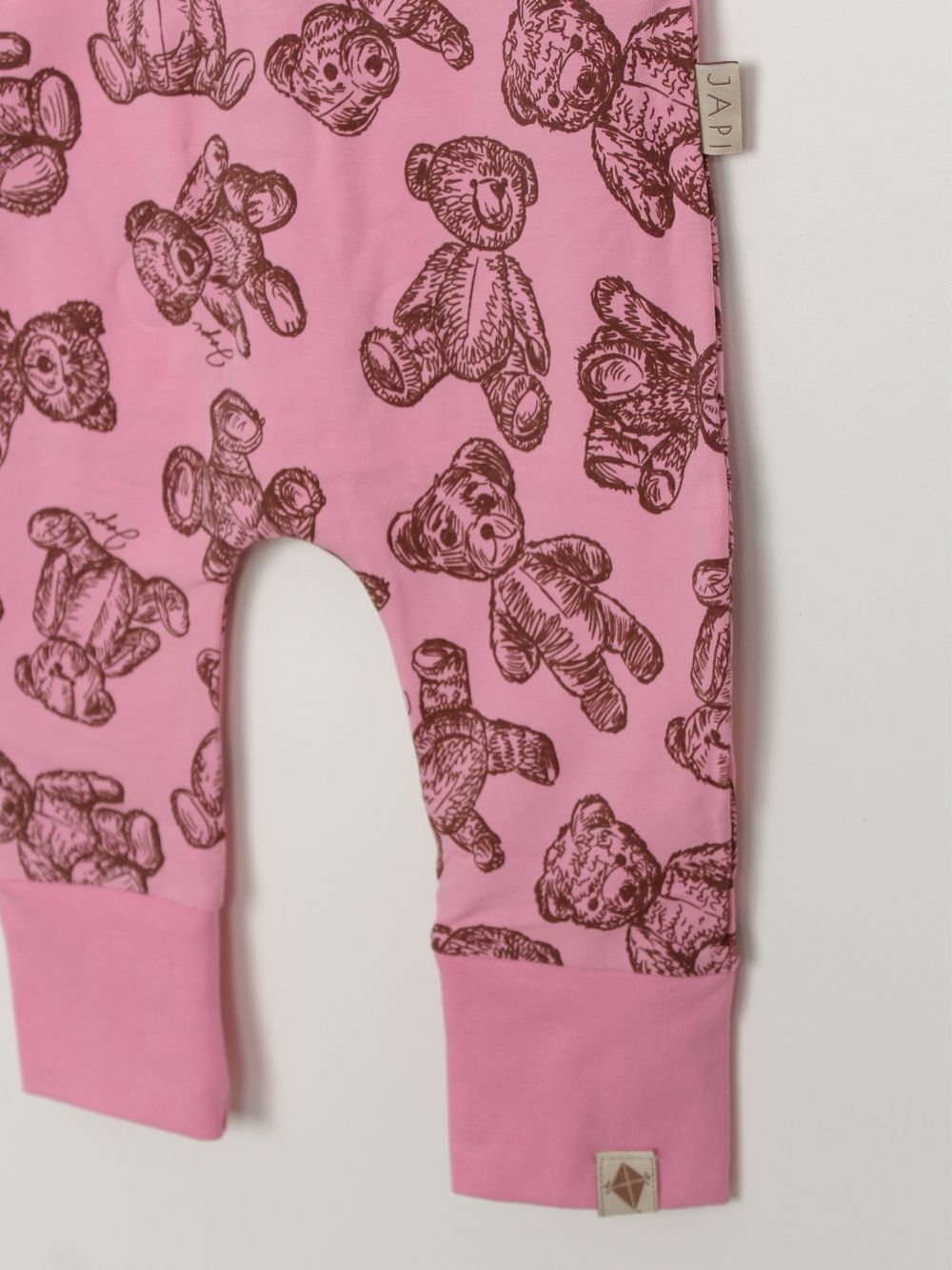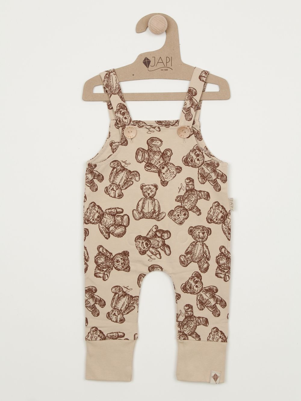 Napravili smo trenirke od 100% pamuka s našim printom plišanog medvjedića na cijeloj površini. Smeđi print lijepo se ističe na bež, plavoj i ružičastoj boji. Trenirka se s prednje strane otvara drvenim gumbima. U donjem dijelu imaju šire pletenice pa ih po potrebi možete prilagoditi.
