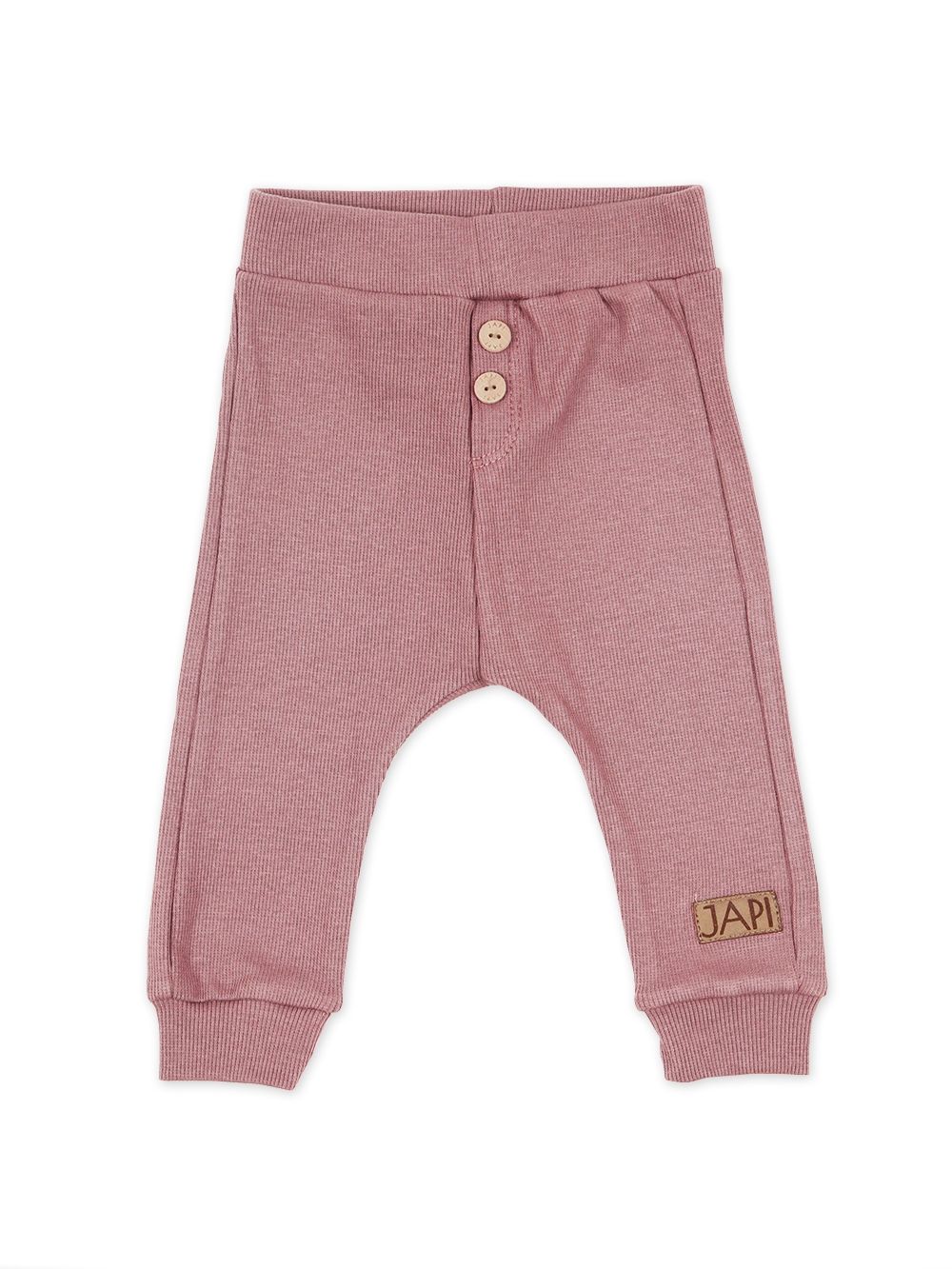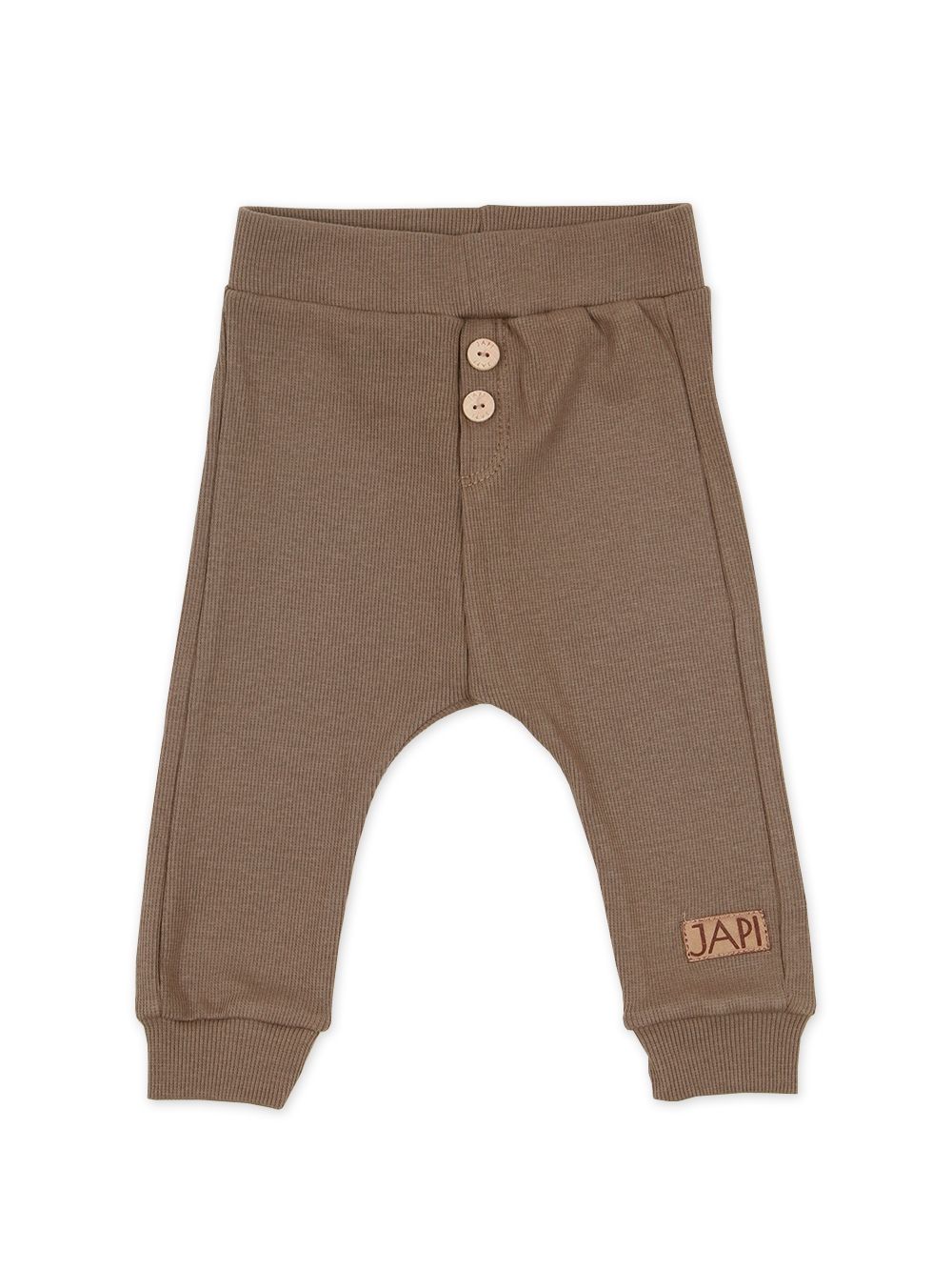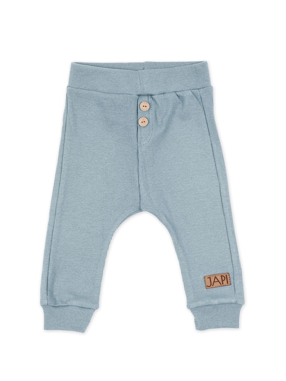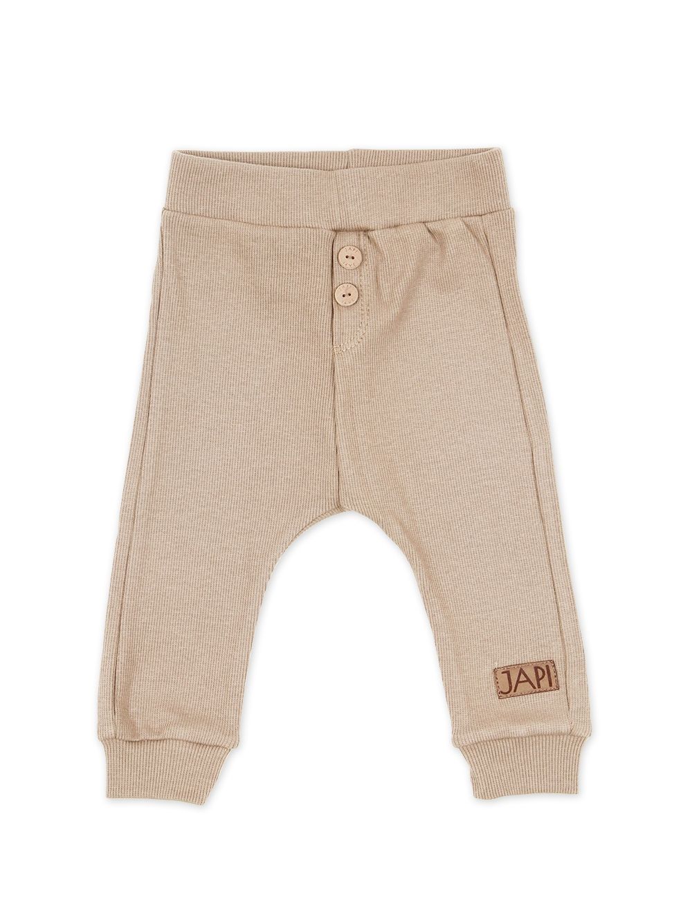 Trenirke izrađene su od 100% pamučne tkanine u tri boje. Udobnog su kroja sa širim strukom s gumicom koja ne pritišće, već okružuje trbuščić i drži na mjestu. Trenirke imaju patente na donjem dijelu, tako da se neće smotati na djetetu.