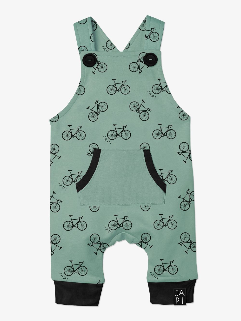 Zeleni donji dio trenirke za najmlađe. Pamučni materijal s cijeloprintom bicikla. Kontrastna crna boja izgleda moderno i stilski. Trenirka ima elastične patente na donjem dijelu hlača. Prednji klokanski džep i kopčanje gumbima na trake.