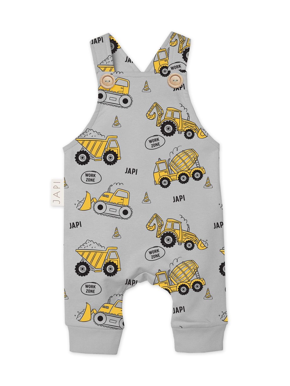 Vaš omiljeni kroj trenirke s tregerimaza djecu oživjeli smo uz željeni print radnog automobila. Donji dio trenirke je ugodnog, opuštenijeg kroja u kojem se djeca mogu dobro kretati i ne ometaju ih u igri. Kopčaju se na drvene gumbe na prednjem dijelu kroz trake. Šire pletenice na hlačama drže ih na mjestu.